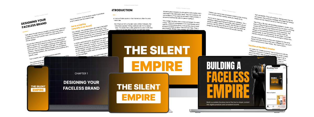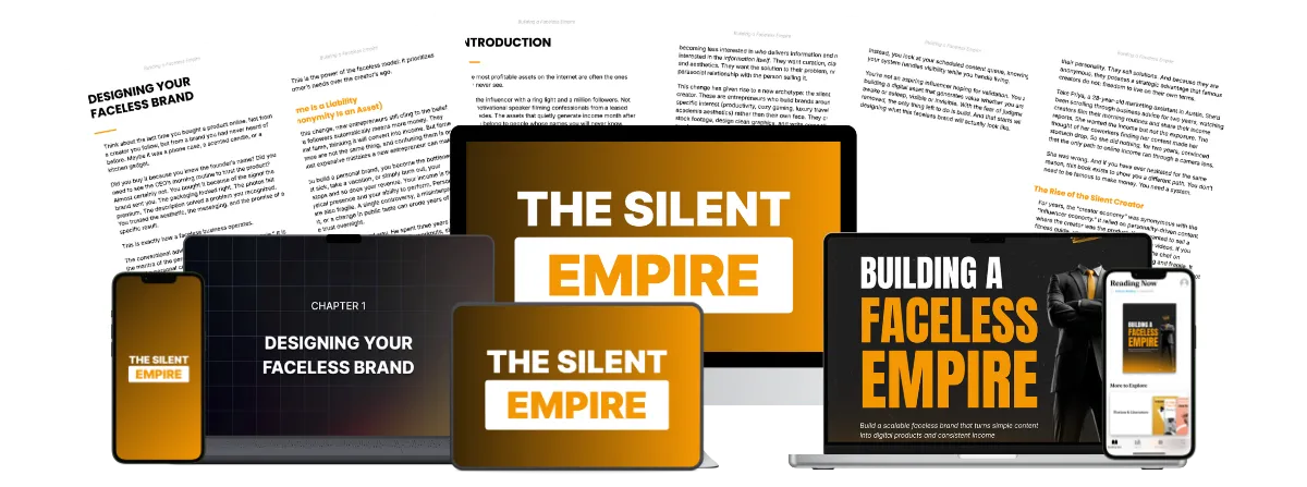 Building a Faceless Empire eBook: A comprehensive, easy-to-follow guide that walks you through building a profitable faceless digital business from the ground up. You will learn how to choose the right niche, create content that captures attention, build simple digital products, and turn that attention into consistent income using a clear system you can follow and scale at your own pace.